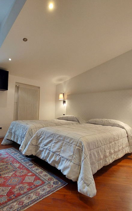 Beautiful family suite, well furnished, double rooms, double bathrooms, one with turkish bath and panoramic porthole, bathrobe, wooden parquet, LCD TV, telephone, minibar, safe, Wi-Fi internet connection, large terrace, north side view Madonna di Campiglio.